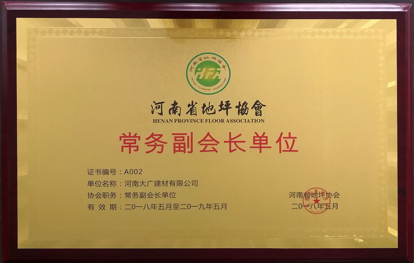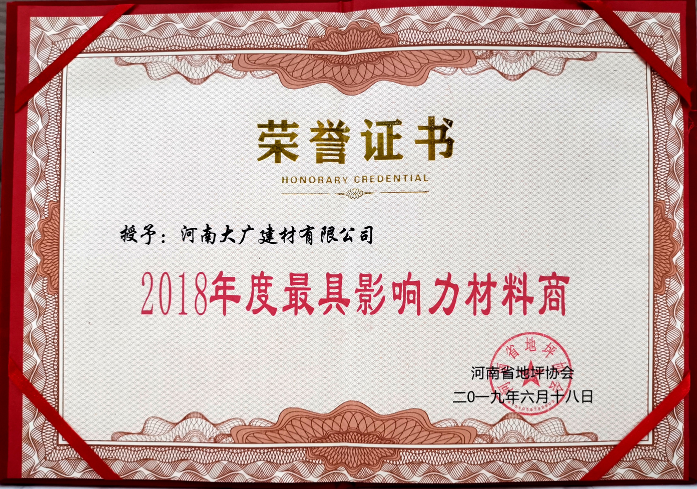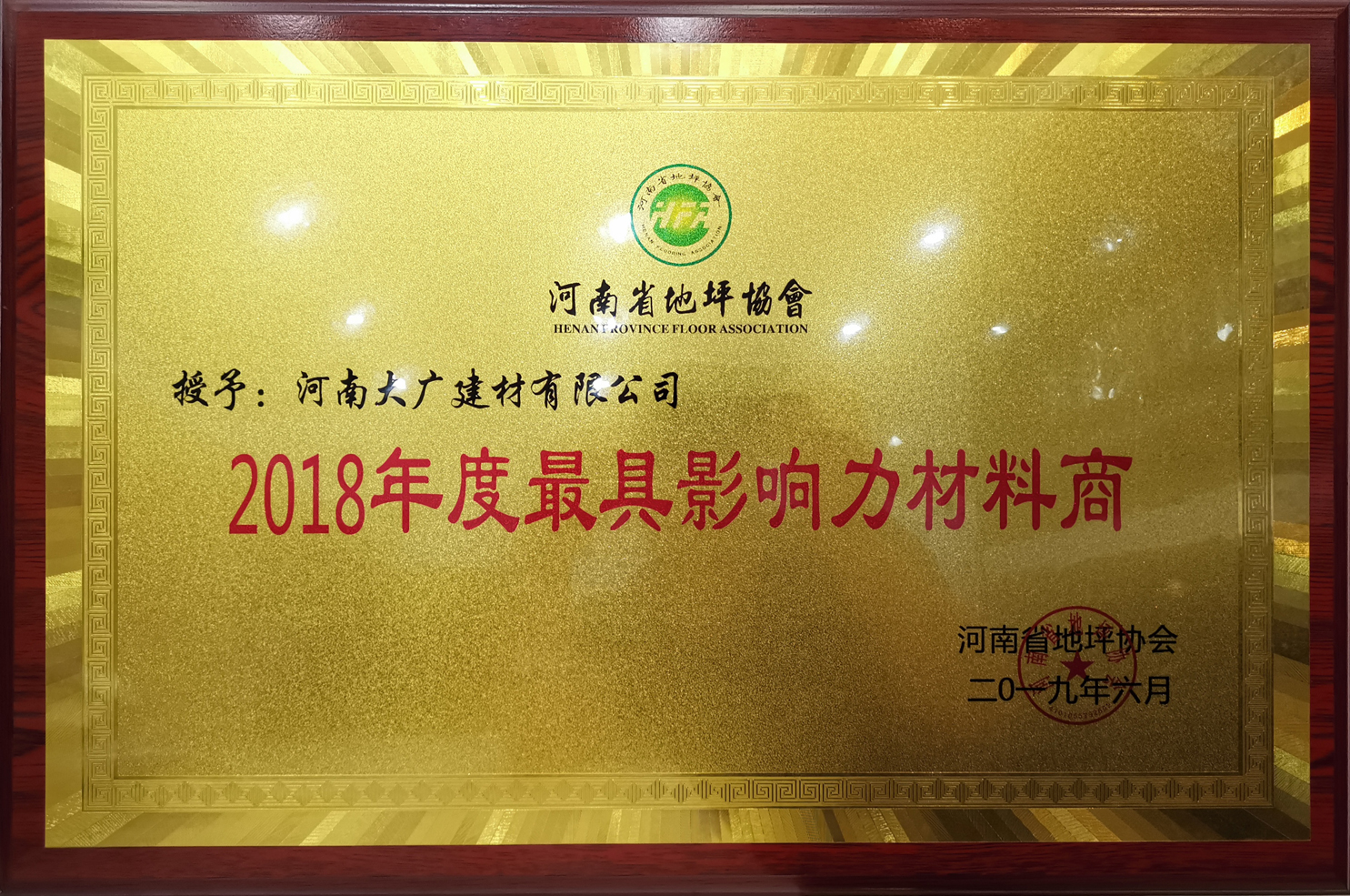 榮獲:河南省地坪協會*具影響力材料商 稱號