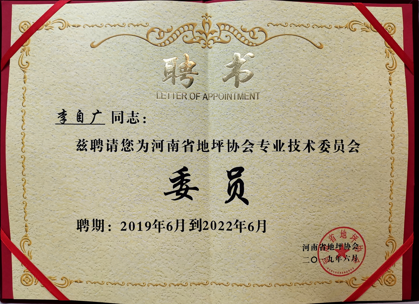 河南省地坪協會**技術委員會:“委員” 證書